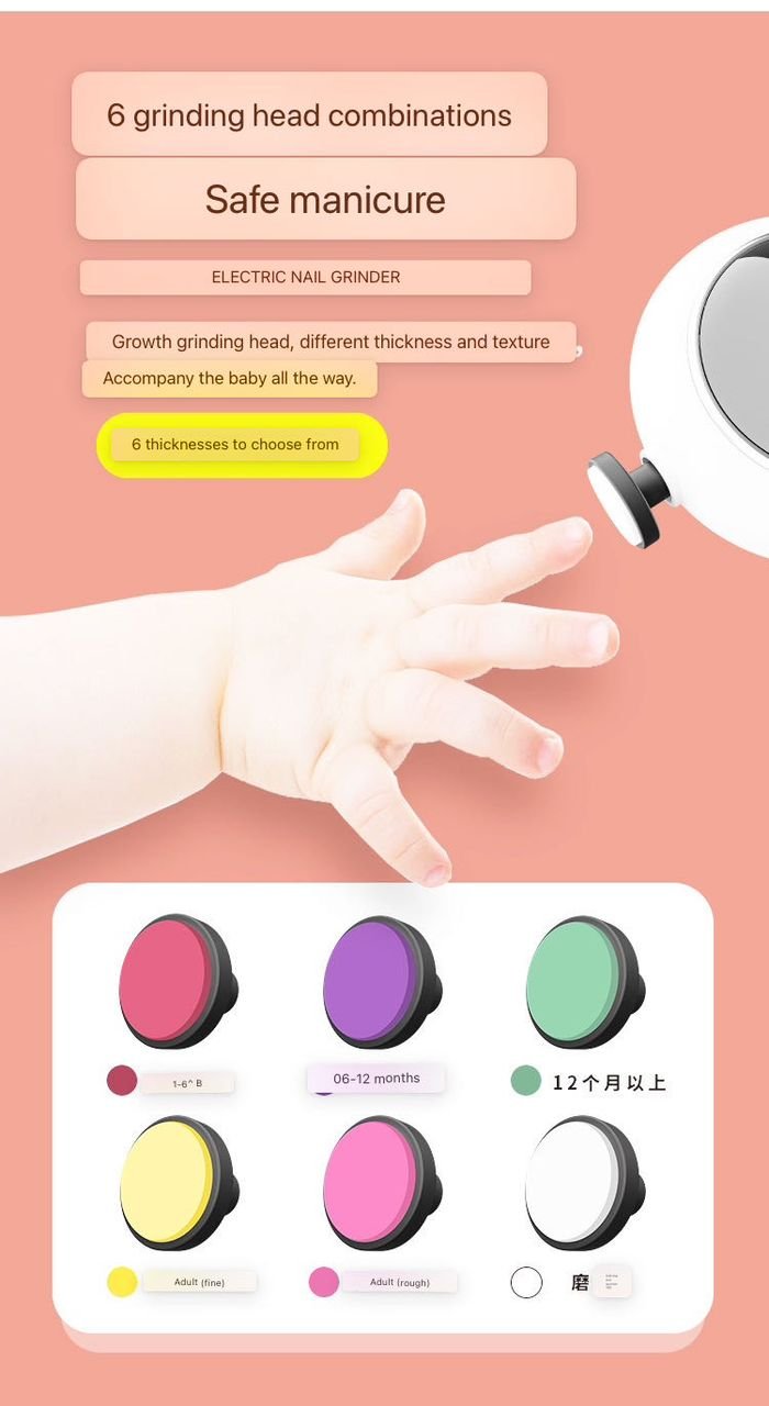 The Baby Electric Nail File comes with multiple filing heads suited for different growth stages. This ensures long-term usability from newborn through toddler years. Each filing head is designed to be soft, non-abrasive, and gentle on baby nails, preventing splits, sharp edges, and scratches. With adjustable speed settings, parents can choose the right level of power depending on nail thickness and age.