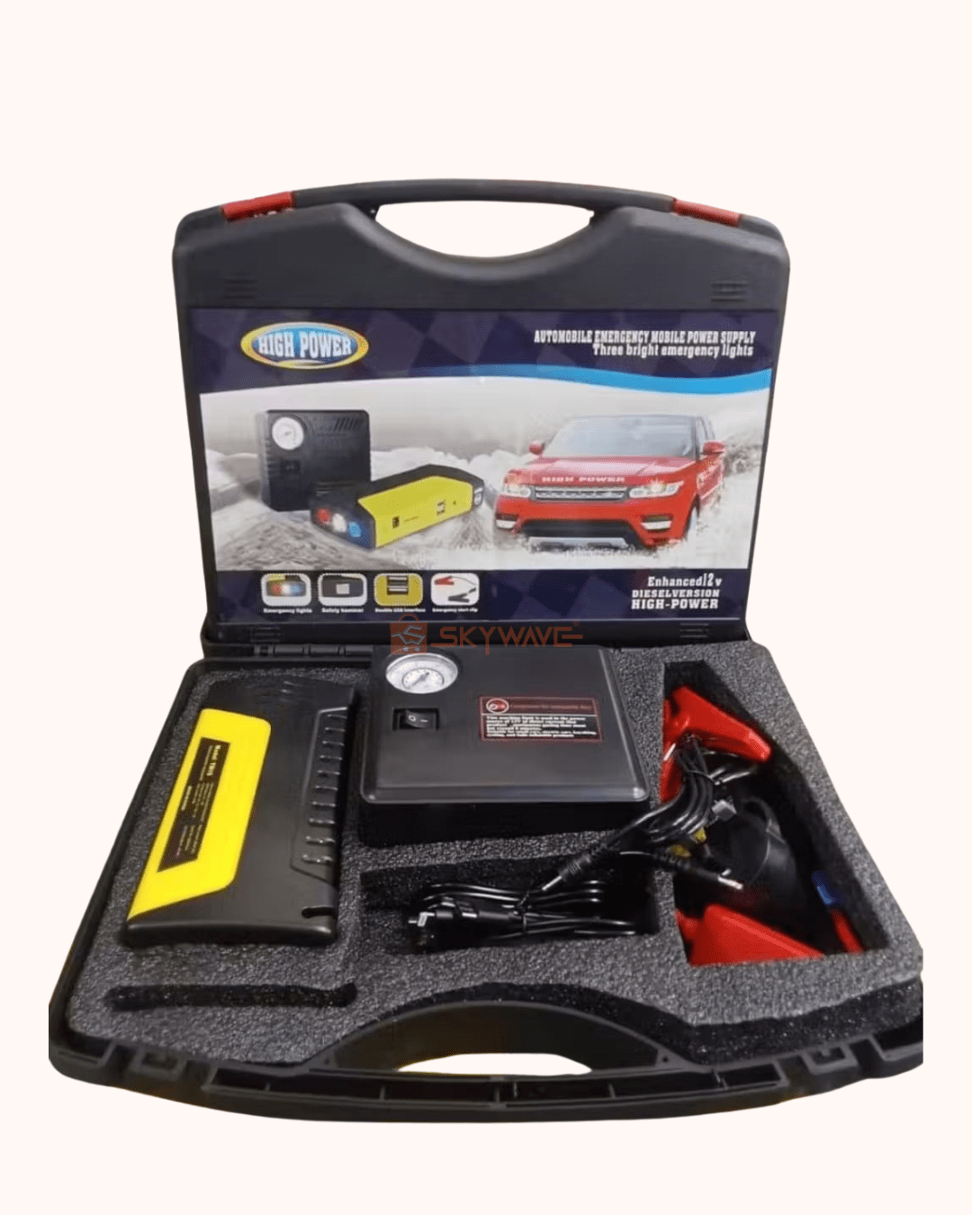 When you’re stranded with a dead battery or a flat tire, you need a solution that’s fast, reliable, and multi-functional. Introducing the High Power Portable Car Jump Starter—a compact, high-capacity power bank designed to get you back on the road in no time. Whether you’re facing a drained battery, low tire pressure, or an uncharged phone, this all-in-one emergency tool has your back.