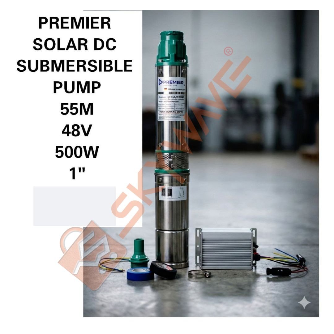 The Premier DC Solar Submersible Pump 55M is a reliable and energy-efficient water pumping solution designed for domestic, agricultural, and small commercial applications. Powered by solar energy, this pump provides a cost-effective and eco-friendly alternative to traditional electric pumps, making it ideal for off-grid locations and areas with limited electricity access. It combines durability, efficiency, and convenience to ensure a continuous water supply wherever it is needed.