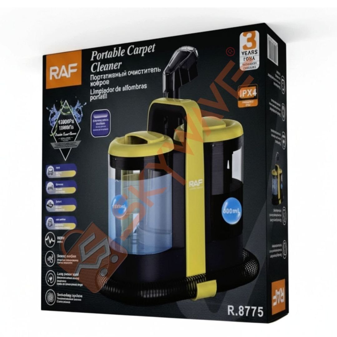 The RAF Portable Carpet Cleaner, Model R.8775, is a versatile and high-performance cleaning solution designed to make carpet maintenance fast, efficient, and hassle-free. Built for homes, offices, and small commercial spaces, this cleaner combines powerful suction, dual cleaning functions, and innovative technology to tackle dirt, dust, and spills with ease. Its compact design and portability make it an ideal tool for maintaining a clean and healthy environment.