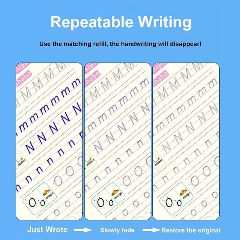 A unique feature of this set is its magic writing capability. Using the included pen, children can write, draw, and practice over and over again without wasting paper. The set comes with one pen, four pen refills, and a pen holder, ensuring that your child can continue practicing without interruption. This makes the set eco-friendly and highly cost-effective, as the books are reusable for multiple learning sessions.