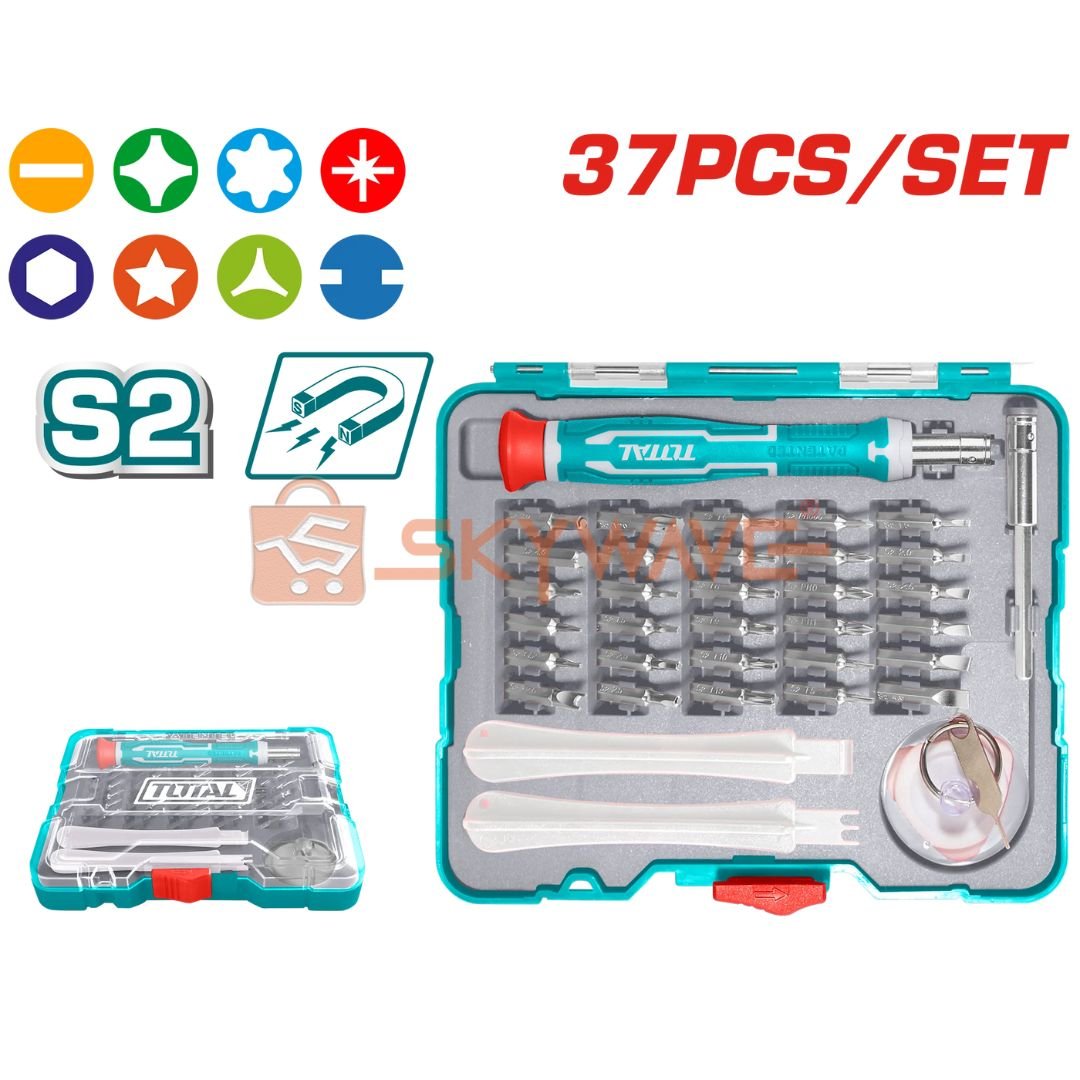 The Total 37 Pcs precision screwdriver set TACSD30376 is ideal for electronics repairs, hobby projects, gadget maintenance, and other precision tasks. Its combination of bits, pry tools, and specialized accessories makes it adaptable to multiple applications, providing users with everything needed in a single, organized set.