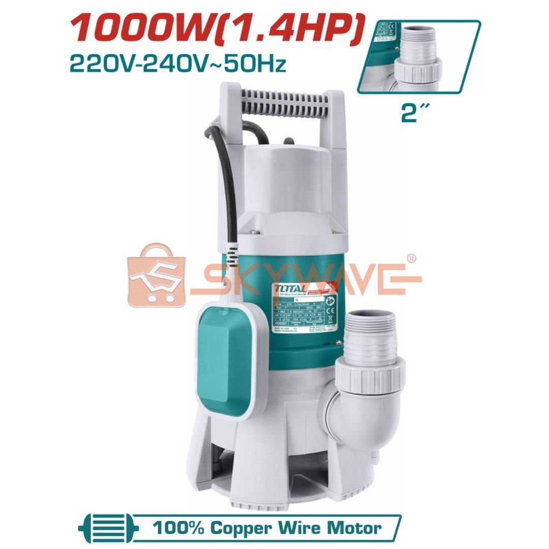In conclusion, the Total Sewage Submersible Pump TWP810001 provides a powerful, reliable, and efficient solution for pumping dirty water. With its 1000W copper motor, 9m submersion capacity, high flow rate, automatic float switch, and robust design, the Total Sewage Submersible Pump is perfect for home, workshop, and industrial water management. Its combination of durability, efficiency, and convenience makes it an essential tool for anyone dealing with water removal tasks.